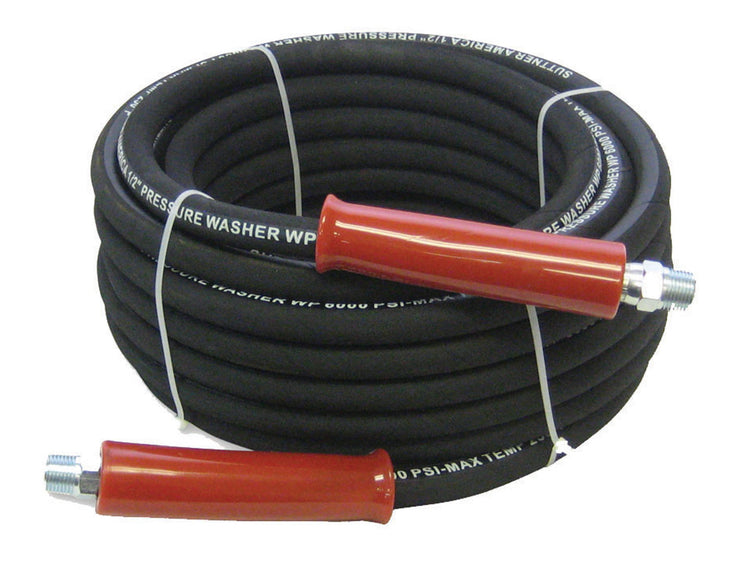 Check out our inventory of industrial high-pressure water hoses. Available in both single and double-wire reinforcement options that are either 4,000 or 6,000 PSI. The different reinforcements correlate to the amount of pressure the hose can withstand. These pieces of equipment are meant for pressure-washing applications and come with bend guards on either end to protect the hose from splitting.
